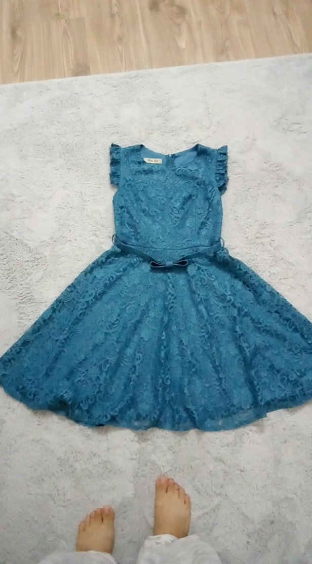 Mavi renkli, dantelli ve işlemeli kız çocuk elbisesi. Kolsuz, straplez yakalı ve vücuda oturan modern klasik tarzda, yumuşak sentetik kumaştan yapılmıştır.