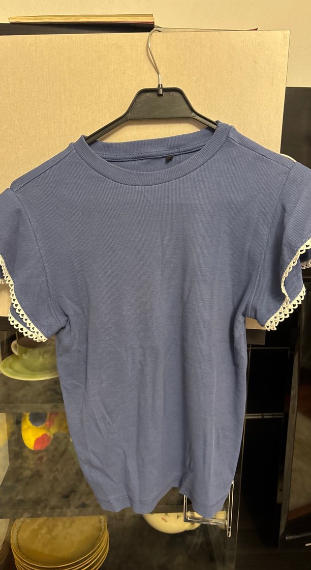 Mavi pamuklu, yuvarlak yakalı, kısa kollu kız çocuk tişörtü. Kollarda dantel detaylarıyla rahat ve şık bir görünüm sunar. Ürünün herhangi bir deformesi yoktur