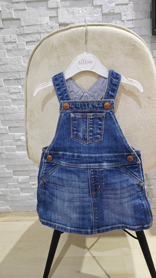 Kız çocukları için askılı, mavi denim elbise. Tokalı askılar ve rahat kesim ile hafif batik desenli, günlük sokak stili için uygundur.