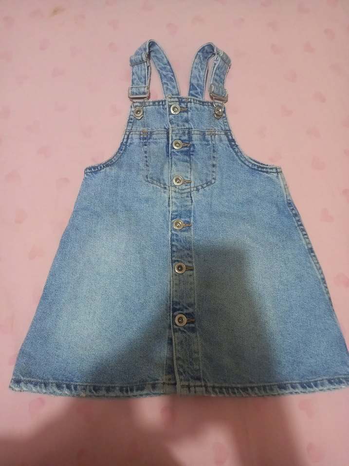 Pastel mavi denim kumaştan, askılı ve fitted kesim kız çocuk tulumu. Tokalı askılar ve iki ön cep içerir, sokak stili için uygun. küçük lekeler var yıkayınca cikabilir