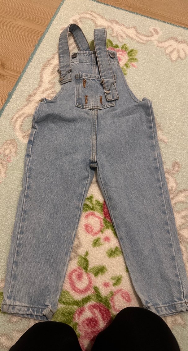 Mavi denim kumaştan, ayarlanabilir tokalı askıları ve hafif batik deseniyle kız çocukları için dar kesim tulum. Önünde aycıgı vardı onu kaybettık tek kusuru bu .