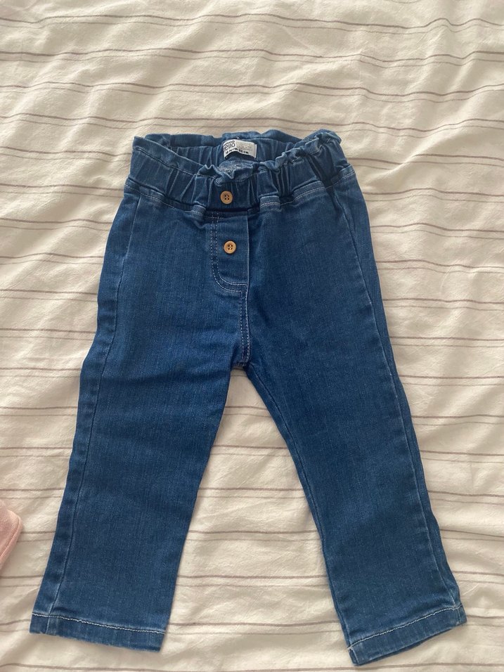 Düğmeli ön kısmı ve sade mavi tasarımıyla, kız çocuklar için dar kesim denim pantolon. 18 aylık bir kez giyildi