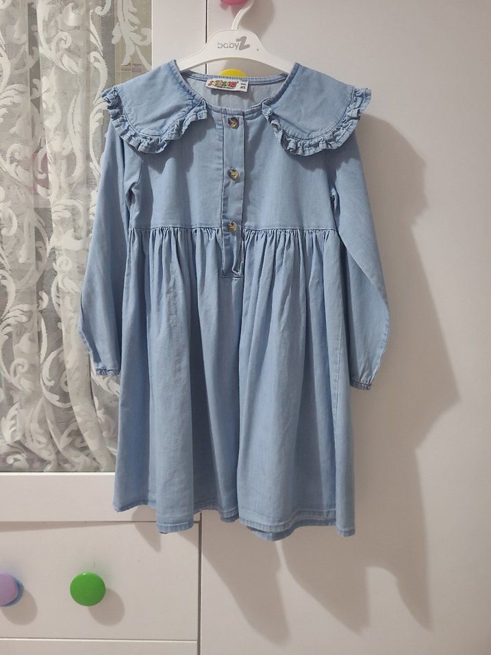 Uzun kollu, yakalı ve fırfırlı detaylı mavi denim kız çocuk elbisesi. Rahat kesimli, normcore tarzda bir tasarım.