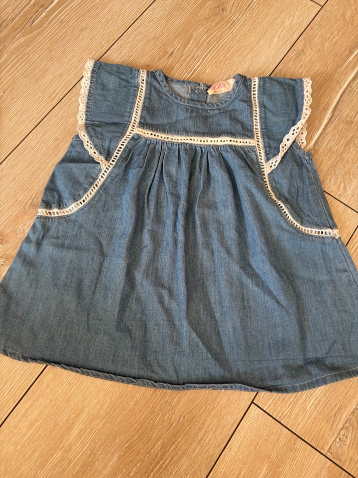 Kolsuz, bol kesim ve tekne yakalı kız çocuk elbisesi. Mavi denimden yapılmış, nakışlı detaylar ve fırfırlarla bohem tarzını yansıtıyor. 2-3 kere giyildi, çok iyi durumda.