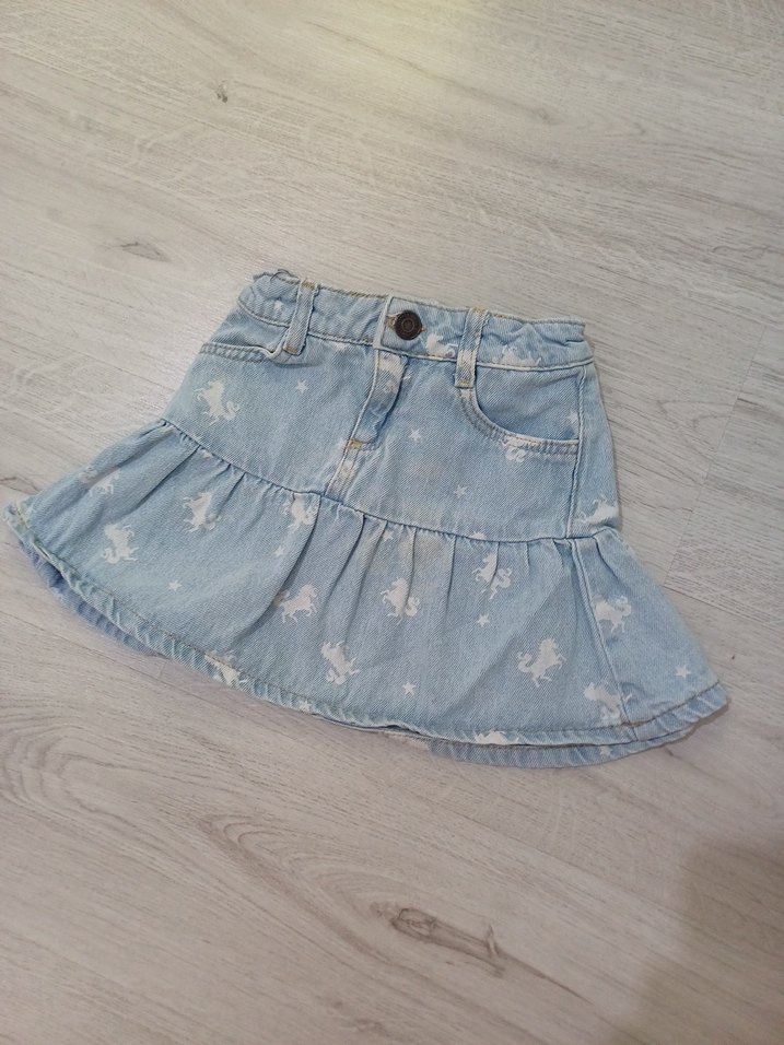 mavi renkte, bol kesimli, fırfırlı detaylı ve hafif batik desenli kız çocuk denim eteği, rahat sokak stili için uygun.