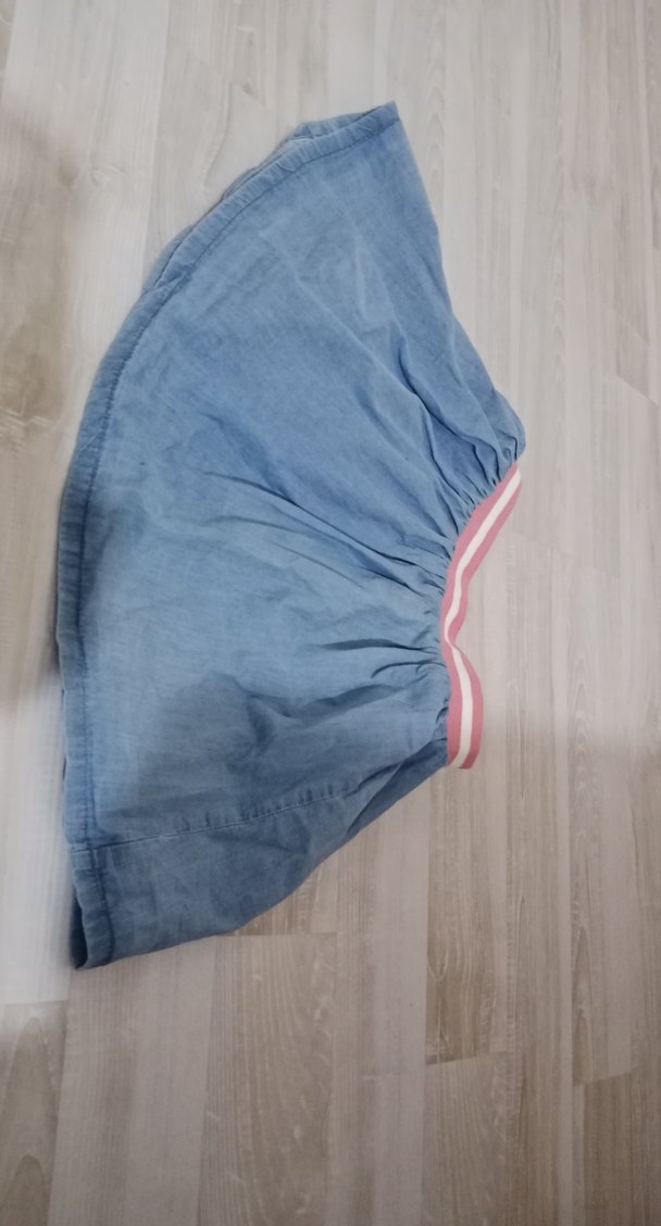 Kız çocuk için rahat kesim, pastel mavi renkli denim etek, fırfırlı ve çizgili bel bandıyla sokak stiline uygun.