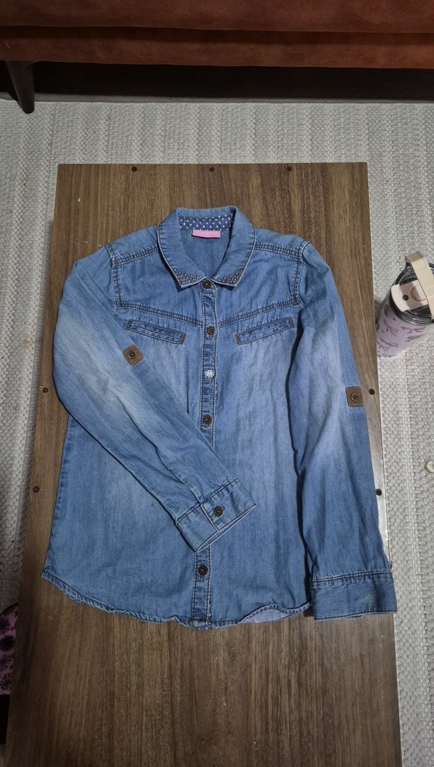 Mavi denim kumaştan yapılmış, uzun kollu, düğmeli ve kesimli yakalı kız çocuk gömleği, regular fit kesim