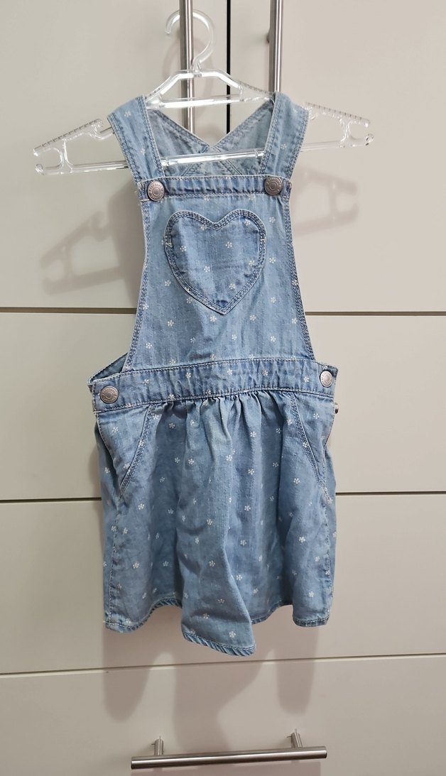 Kolsuz, mavi denim kumaştan, fitted kesim ve askılı tasarımlı elbise. Düğmeli askılar ve kalp şeklinde cep detayı bulunur. Hafif batik desene sahip, gündelik şık tarzda elbise.