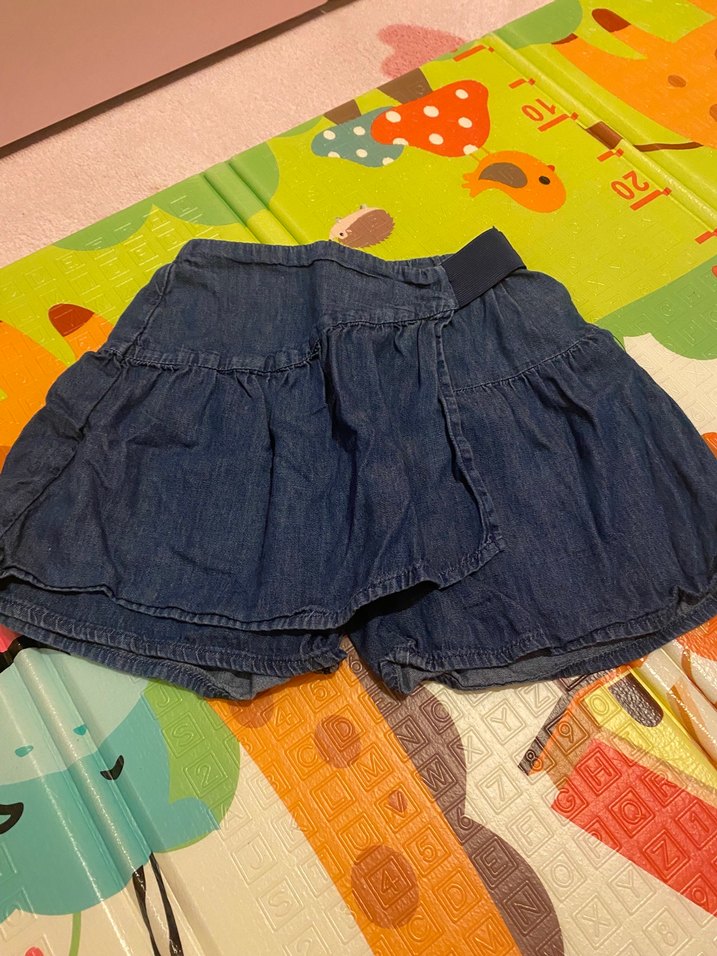 Renkli mavi denim kumaştan, bol kesim ve pilili tasarıma sahip kız çocuk şort etek