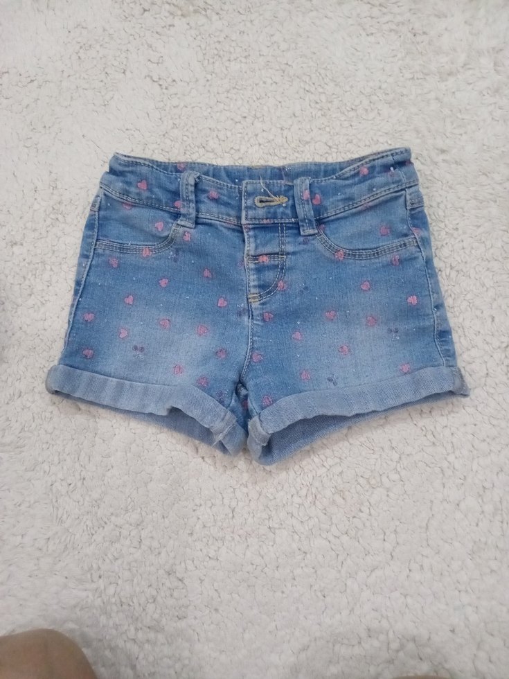 4-5 yaş Pastel tonlarda kalp desenli, düğmeli ve fit kesim mavi denim kız çocuk şortu, sokak modasına uygun.