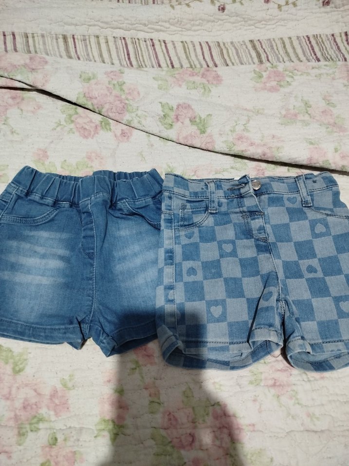 Mavi tonlarda, düğmeli ve fitted kesime sahip kız çocuk denim şortlar. Biri hafif batik desenli, diğeri kalpli kareli desenli, sokak stiline uygun.