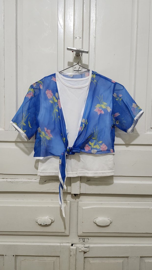 Kız çocuklar için, kısa kollu, drapeli ve straplez tasarımlı bolero. Yumuşak sentetik kumaştan, pastel mavi çiçek desenli, boy 44 koltuk altından genişlik 35. iki parça. bolero boyu 33 cm . 2 parça olarak gönderilecek. boleronun önünde sökük var görseldeki gibi