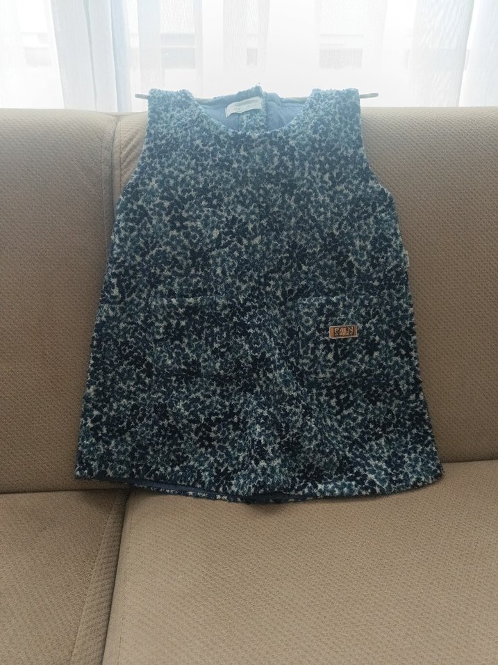 Kız çocukları için mavi desenli, düğmeli, yuvarlak yaka ve kolsuz elbise. Sentetik kumaştan, rahat ve bol kesim.