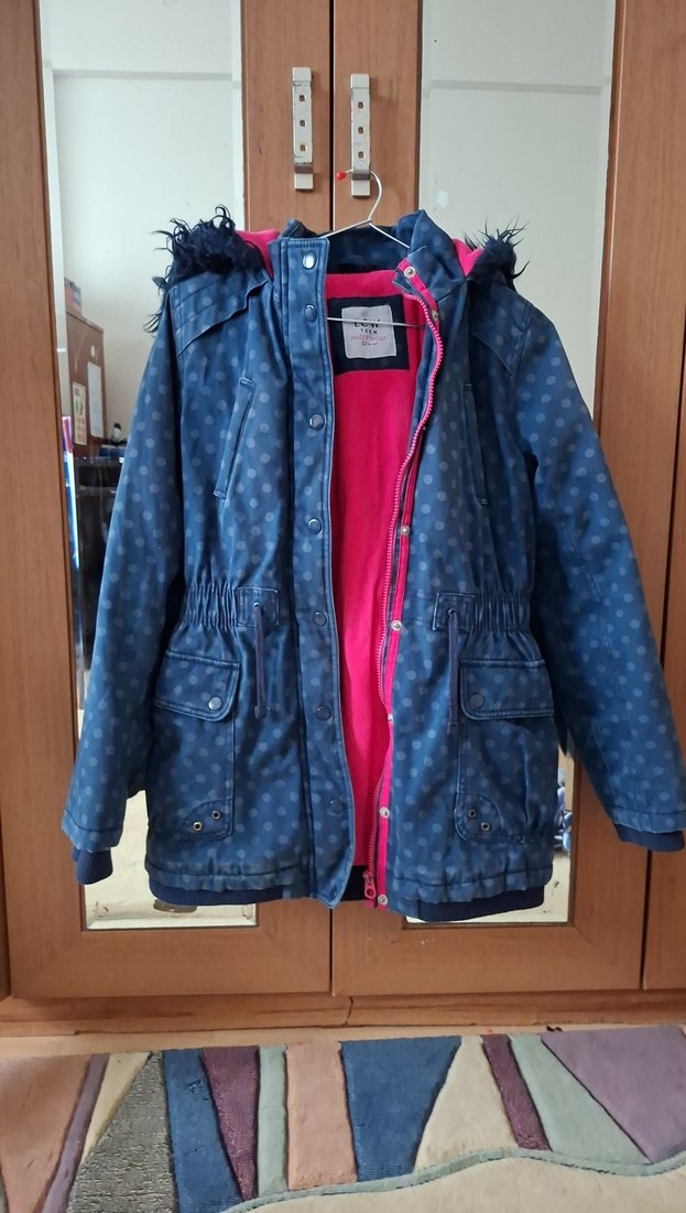 Kız çocukları için bol kesim mavi kot ceket, desenli, kesik yaka, düğmeli ve canlı pembe astarlı. Trend sokak giyimi tarzında. resimde görüldüğü gibi herhengi bir sorunu yok kalıbı küçük benim kızım 9_10 yaşta giydi