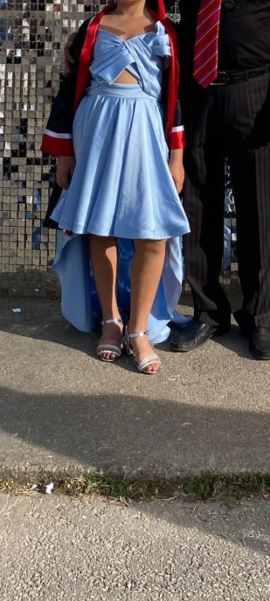 Kız çocukları için parlak mavi denim kumaştan, drapeli özel gün elbisesi, modaya uygun sokak stiliyle uyumlu. mezuniyet için aldım onu kısa arkasi uzun model