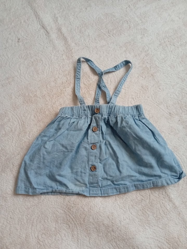 Düğmeli ve askılı, bol kesim kız çocuk mavi kot etek, pastel tonlarda bohem tarz sunar.