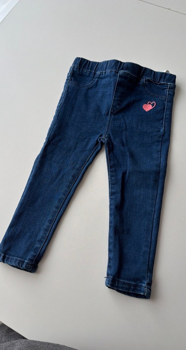 Kız çocuklar için düğmeli, fitted kesim mavi denim pantolon. Küçük kalp detayıyla renkli ve şık bir görünüm sunar.