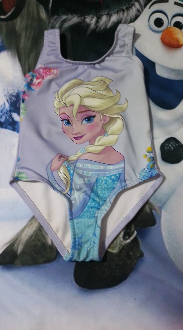 Kolsuz, mavi Elsa baskılı mayo, pastel renklerde ve plaj kullanımı için uygundur.