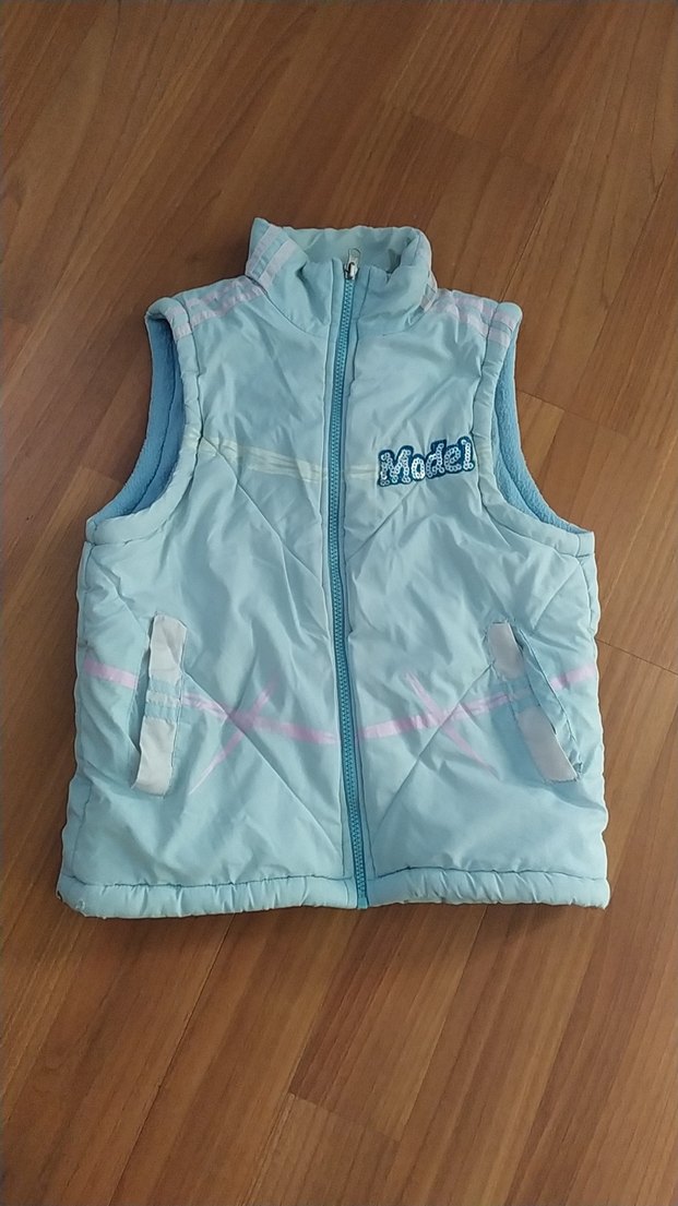 Pastel mavi renkli, fermuarlı ve kolsuz, yumuşak ve sıcak kumaştan yapılmış kız çocuk yeleği. Sade tasarımlı, iki ceplidir ve göğsünde "Model" yazısı bulunur.
