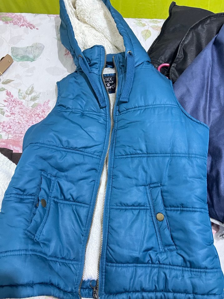 Koyu mavi renkte, fermuarlı ve cepleri olan, yakalı kolsuz,ve kapşunlu rahat kesim yelek. Yumuşak ve sıcacık tutuyor çok temiz hiç bi Sorunu yok 38 beden aynı modleden kırmızı rengide mevcut