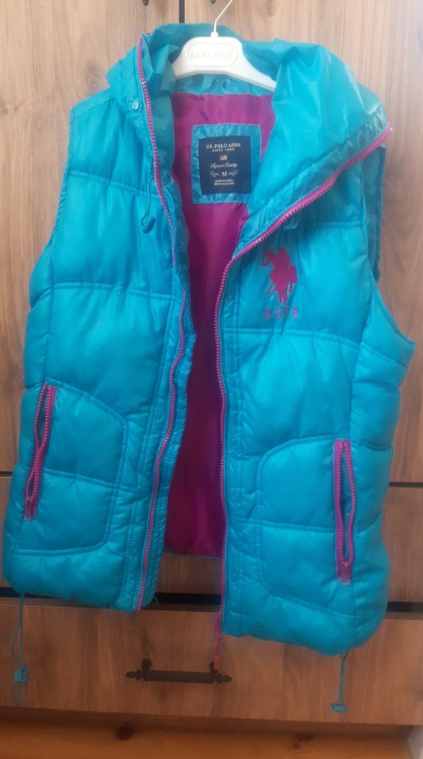 Fermuarlı cepleri ve yüksek yakası olan, yumuşak kumaştan yapılmış, fitted kesim mavi kız çocuk yeleği. Casual sokak stili için uygun. Beden M. çok az kullanıldı