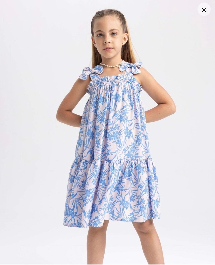 Pamuk kumaştan, askılı ve fırfırlı detaylı, bol kesim, mavi pastel tonlarda bağlama desenli kız çocuk elbisesi. Birkaç kere giydi kızım. Rengi, duruşu çok güzel.