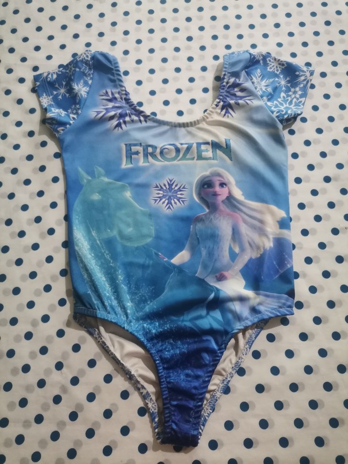 Renkli mavi, kolsuz, V yakalı kız çocuk mayosu. Baskılı Frozen desenli ve boncuk detaylı.