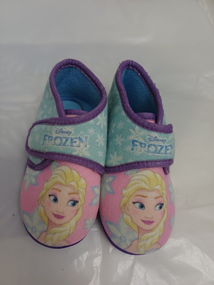 Pastel mavi kız çocuk terlikleri, baskılı Frozen deseni ve kolay kullanım için cırt cırtlı bant içerir. Yumuşak ve sıcak dokulu kumaştan yapılmıştır. ❄️22 numara