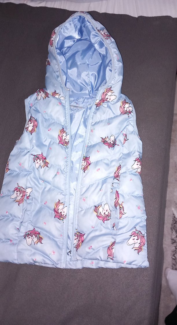 Kapüşonlu, fermuarlı mavi yelek, unicorn baskılı ve kolsuz. Yumuşak ve sıcak kumaş, trend bir görünüm sağlar.