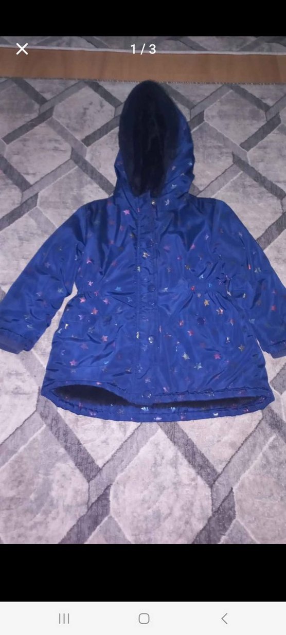 Bu bol kesim mavi mont, kapüşonlu ve düğmeli olup, yumuşak ve sıcak kumaştan yapılmıştır. Sokak stili ve hafif desenlidir.