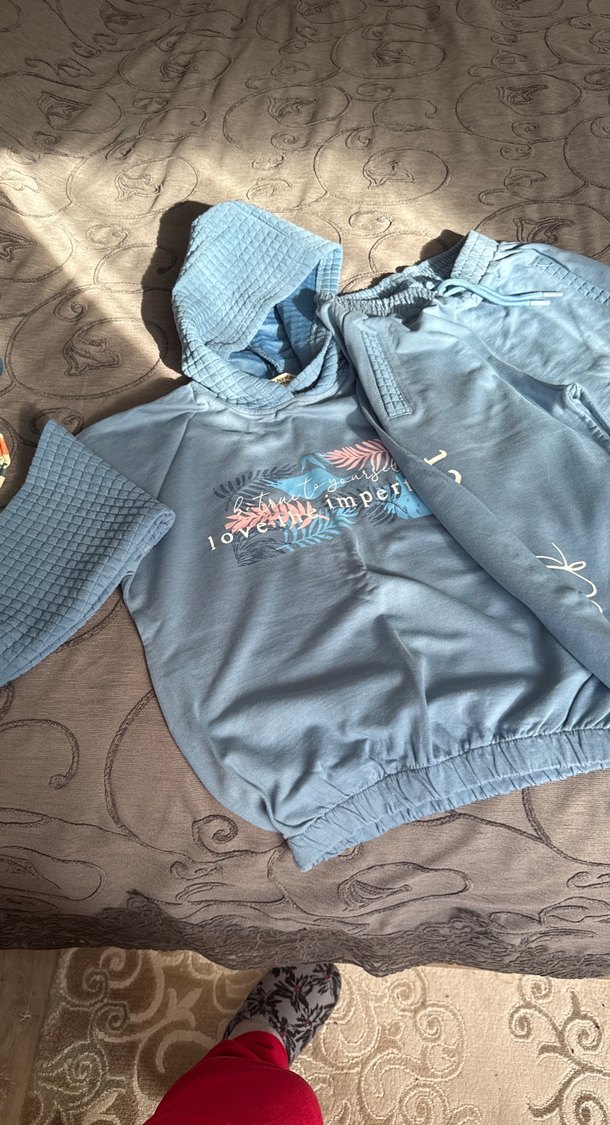Kız çocuk için bol kesim, kısa boylu mavi-gri tonlarda kapüşonlu ve fermuarlı uzun kollu eşofman takımıdır.