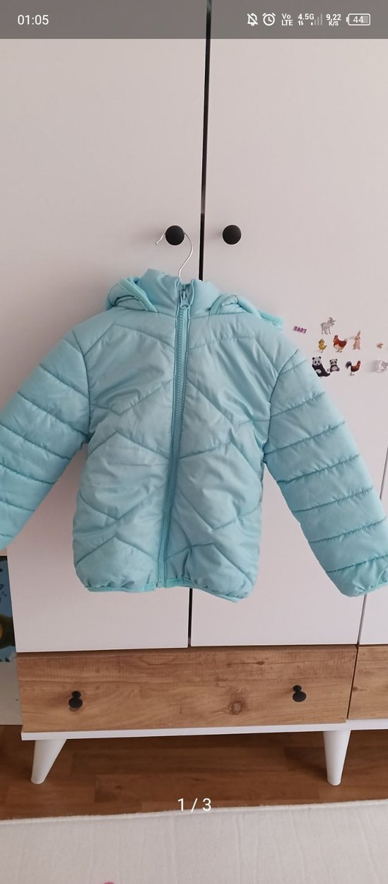 Pastel mavi renkli, fermuarlı ve yakalı kız çocuk montu, sokak stiline uygun ve yumuşak dokulu. Sayılı kullanılmıştır. Temiz ve sorunsuzdur.