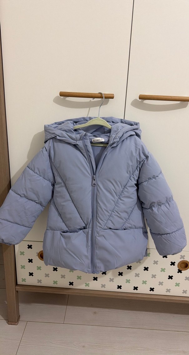 Düz mavi renkte, kapüşonlu ve fermuarlı, yumuşak ve sıcak kumaştan yapılmış kız çocuk montu. Notch yakalı ve sade tasarımlı.