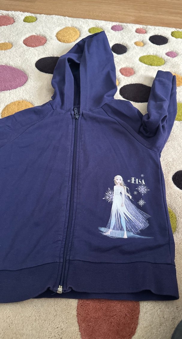 Kız çocuk için fermuarlı, kapüşonlu ve uzun kollu, Elsa baskılı, koyu mavi renkli, yumuşak ve sıcak dokulu sweatshirt. ❄️