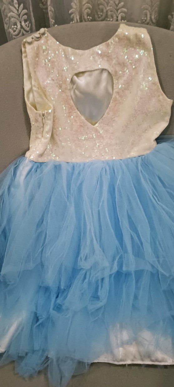V yaka, kolsuz, işlemeli parlak üst kısmı ve yumuşak sentetik kumaştan pastel mavi kat kat fırfırlı eteği olan kız çocuk elbisesi.