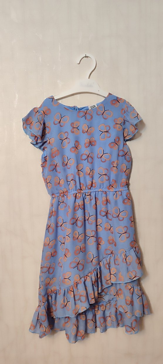 Mavi renkte, kısa fırfırlı kollu, kelebek desenli ve bol kesim kız çocuk elbisesi. Yumuşak kumaştan, yuvarlak yakalı. Boynu cıtçıtlı. Eteği astarlı. 6-7-8 yaş uyumlu ihraç fazlası sıfır etiketsiz