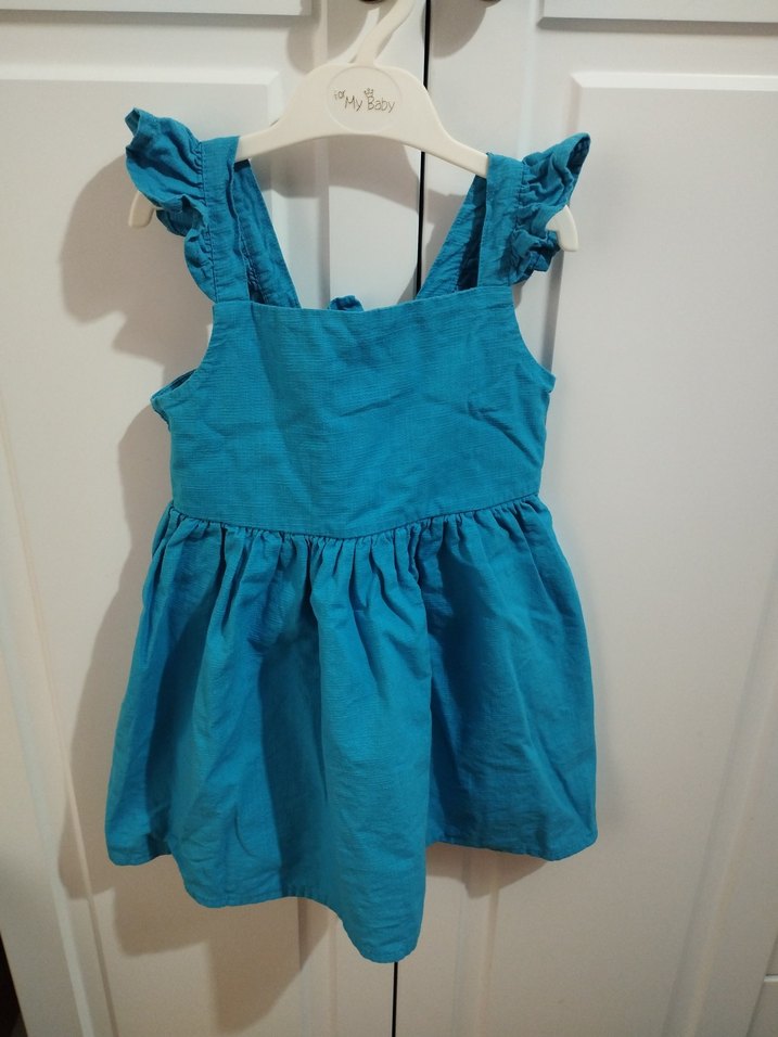 Keten kumaştan, fırfırlı askılı ve straplez yaka detaylı, salaş kesim mavi elbise.
