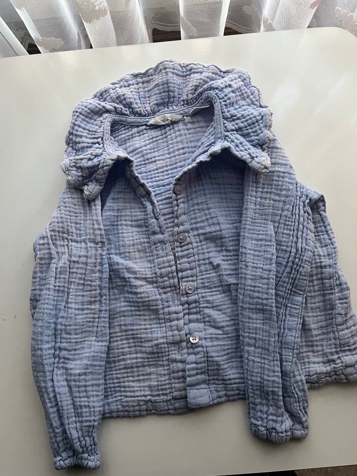 Kız çocuk için keten kumaştan, düğmeli, yakalı ve uzun kollu rahat kesim mavi gömlek. Bohem tarzda sade tasarım.