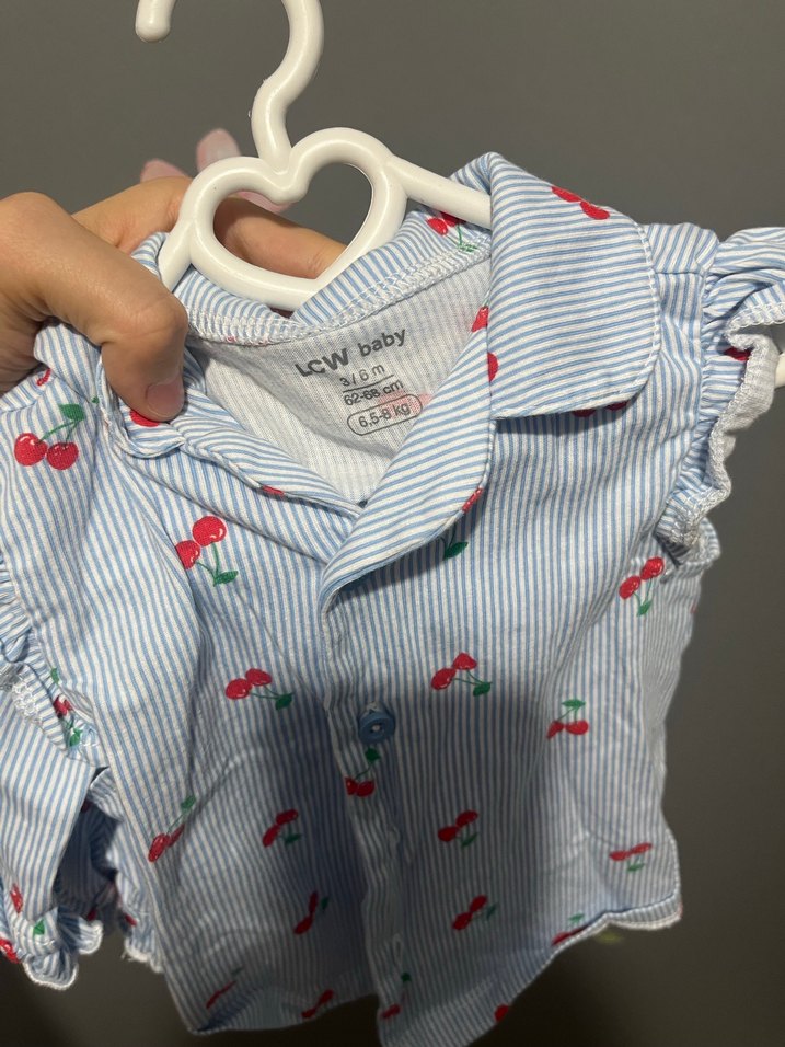 Mavi pamuklu, kısa kollu, düğmeli, yakalı ve bol kesim kız çocuk gömleği. Kiraz desenli, trend sokak stili için uygundur. Sadece denenmek için giyildi dolapta durduğu için kırışmış 1 kere denendi ama olmadı sıfırdan farksız