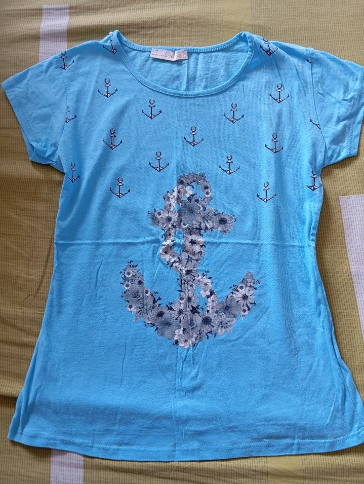 Kız çocuk tişörtü, kısa kollu ve yuvarlak yakalıdır. Pastel mavi renkte, çapa ve çiçek baskılarıyla, yumuşak sentetik kumaştan üretilmiştir.