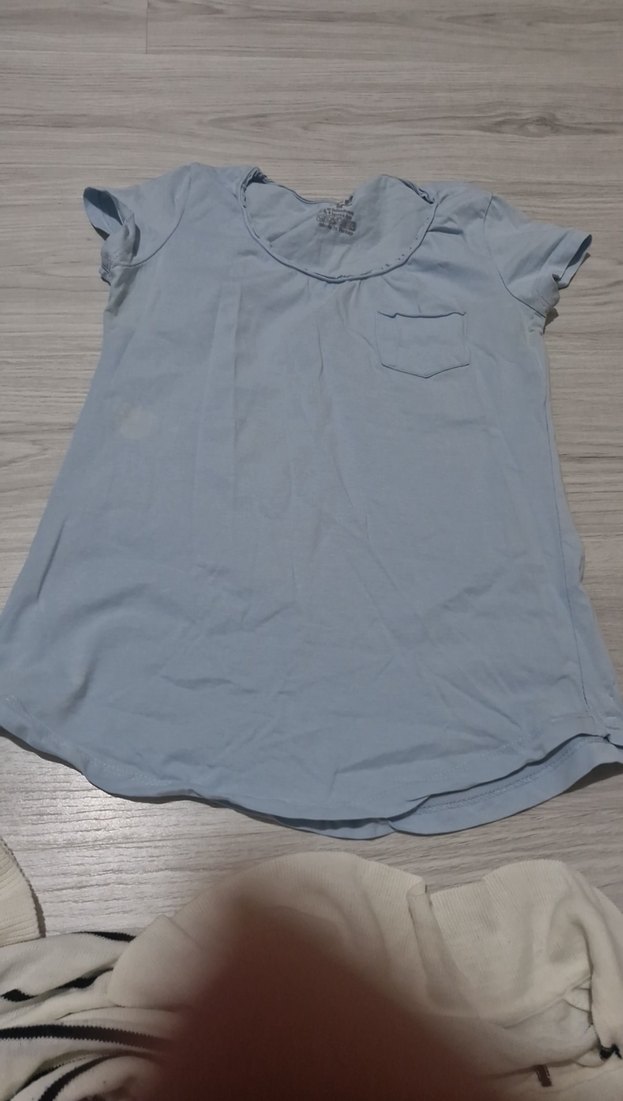 Kız çocuk için rahat kesim, kısa kollu, bisiklet yaka, yumuşak keten kumaştan yapılmış sade mavi tişört. Küçük göğüs cebine sahip, normcore tarzda.