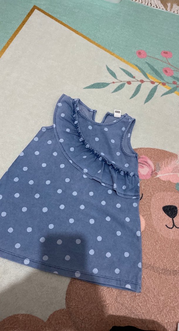 Kız çocuk için kolsuz, bol kesim ve bisiklet yaka denim elbise. Gri tie-dye puantiye deseni ve fırfır detayı ile rahat ve şık.