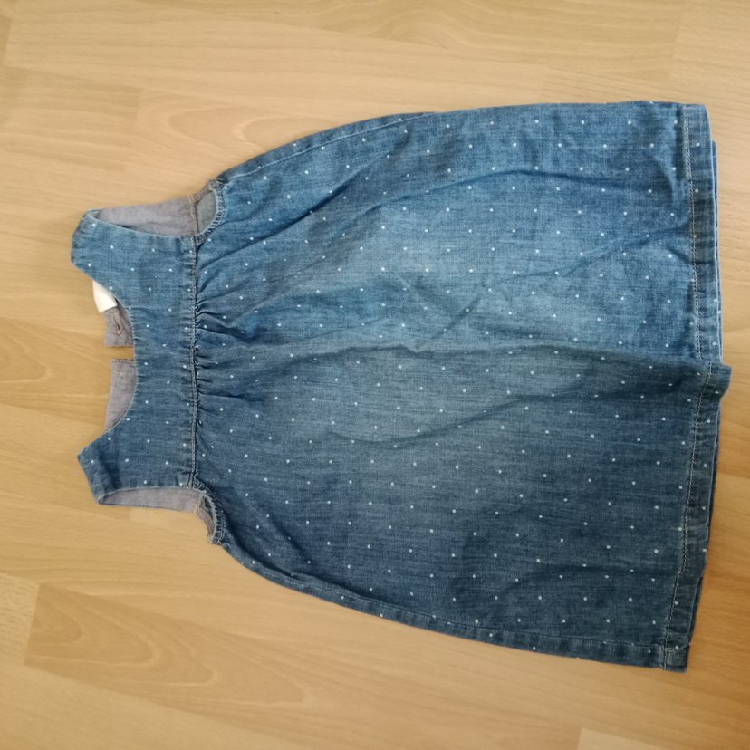 Kolsuz, bol kesim kot elbise. V yaka ve düğme detaylı, mavi-gri tonlarında, hafif noktalı desene sahip.