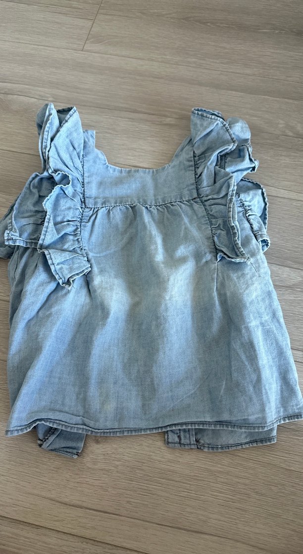 Pastel mavi renkte, yumuşak kot kumaştan yapılmış, fırfırlı ve askısız, bol kesim kız çocuk bluzu.