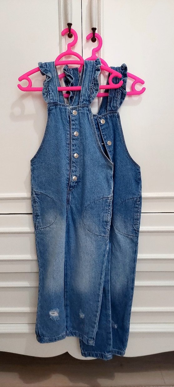 Düğmeli, askılı, bol kesim mavi kot kız çocuk slopet, sokak modasına uygun.