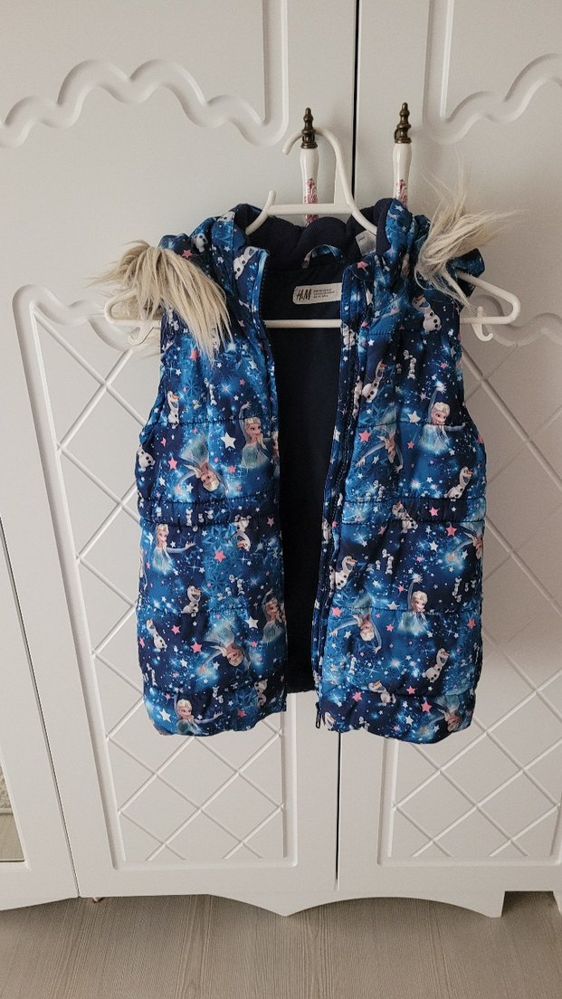 Kız çocuklar için mavi, kürklü kapüşonlu, kolsuz ve fitted kesim yelek. Yumuşak ve sıcak kumaştan, tie-dye desenli, günlük kullanıma uygun.