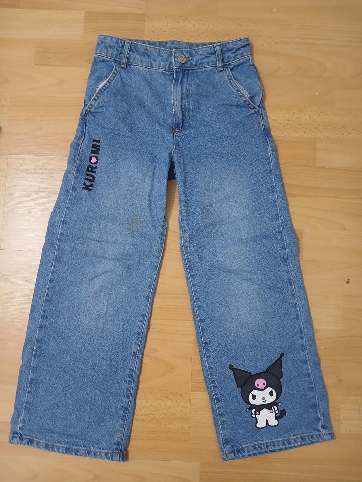 Kız çocuklar için bol kesim mavi kot pantolon, pastel tonlu ve eğlenceli Kuromi baskılıdır. Velcro detayı bulunur.
