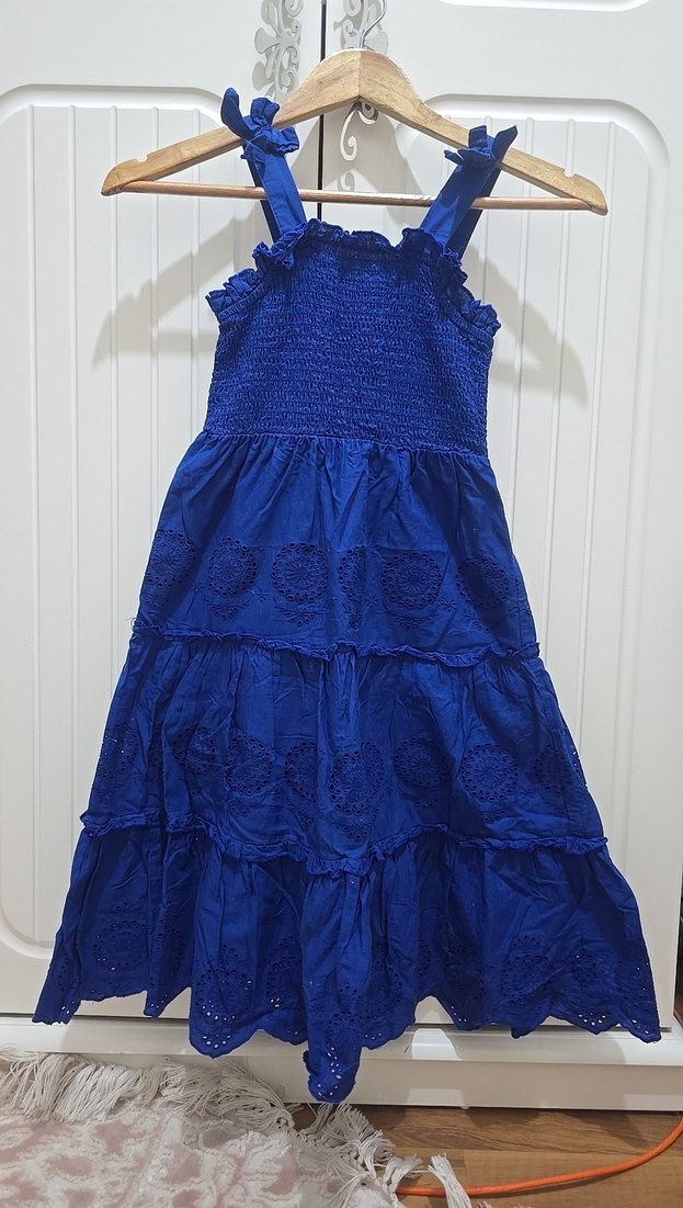 Nakışlı, fırfırlı ve askılı detaylara sahip mavi bohem kız çocuk elbisesi. Straplez yaka ve bol kesim ile tasarlanmıştır. ütüsüz resim çektiğim için simdiden özür dilerim.