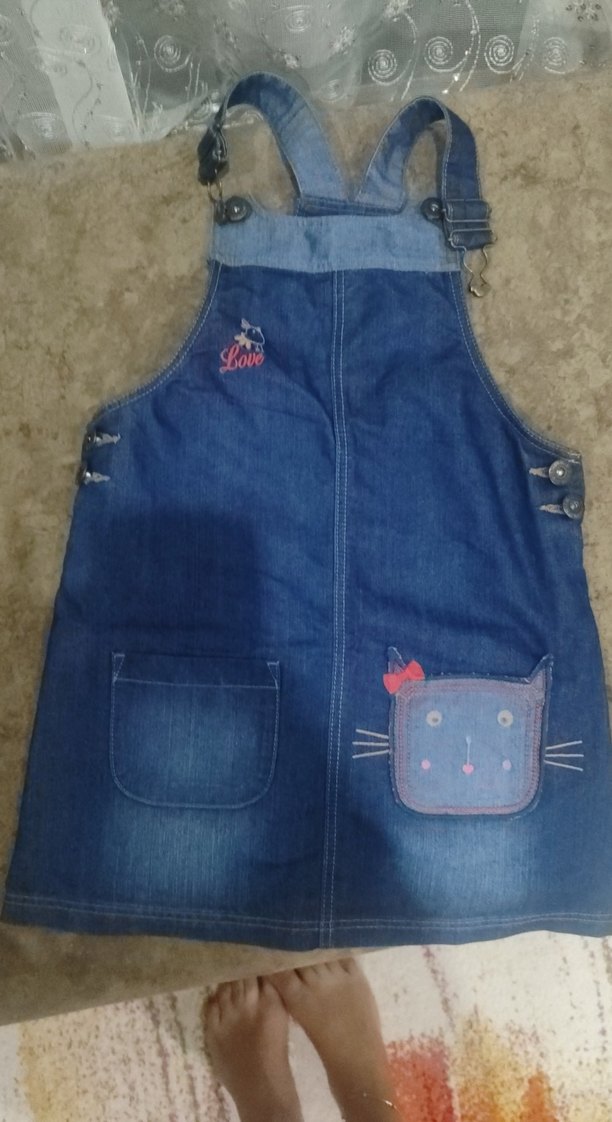 Kız çocukları için mavi denimden yapılmış, fitted kesim, düğmeli, kolsuz ve nakışlı detaylara sahip salopet. Sokak stili için uygun.