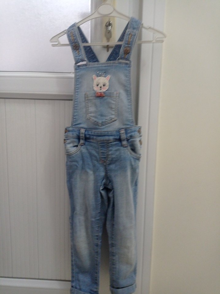 Kız çocukları için ayarlı tokalı askılı, önü nakışlı mavi denim tulum. Sokak stiline uygun.